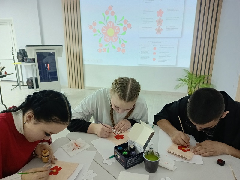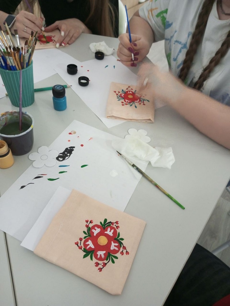 Специалисты Центральной библиотеки провели увлекательный мастер-класс по росписи тканевого мешочка с элементами местного культурного кода - «Свободно-кистевой росписи бассейна реки Моша» для учеников 2 школы.