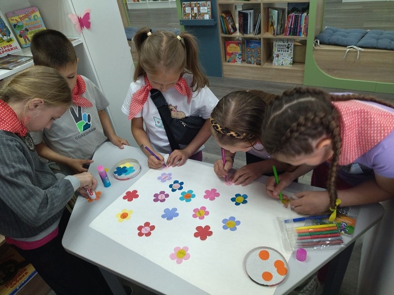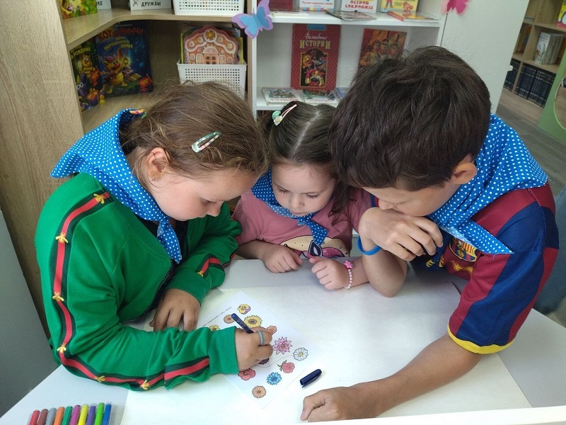 В ходе квеста ребята познакомились с фондом библиотеки в игровой форме, рисовали яркие летние цветы и гуляли по интерактивной поляне, развивая внимание и память.