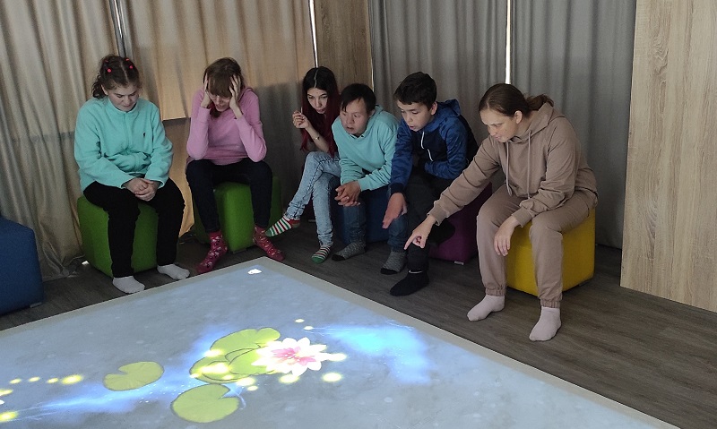 В завершение все участники уютно собрались под одеяльцем малышки Сони и любовались волшебным ночным прудом на интерактивном полу.