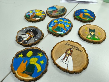 Участники создавали яркие рисунки на спилах акриловыми красками, вдохновляясь сюжетами и персонажами из любимых произведений.