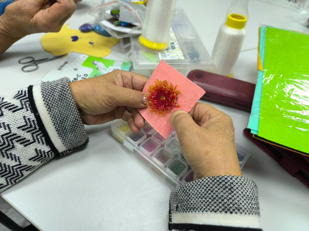 На последнем занятии участницы завершили оформление своих работ, прикрепили застежки и обшили край.