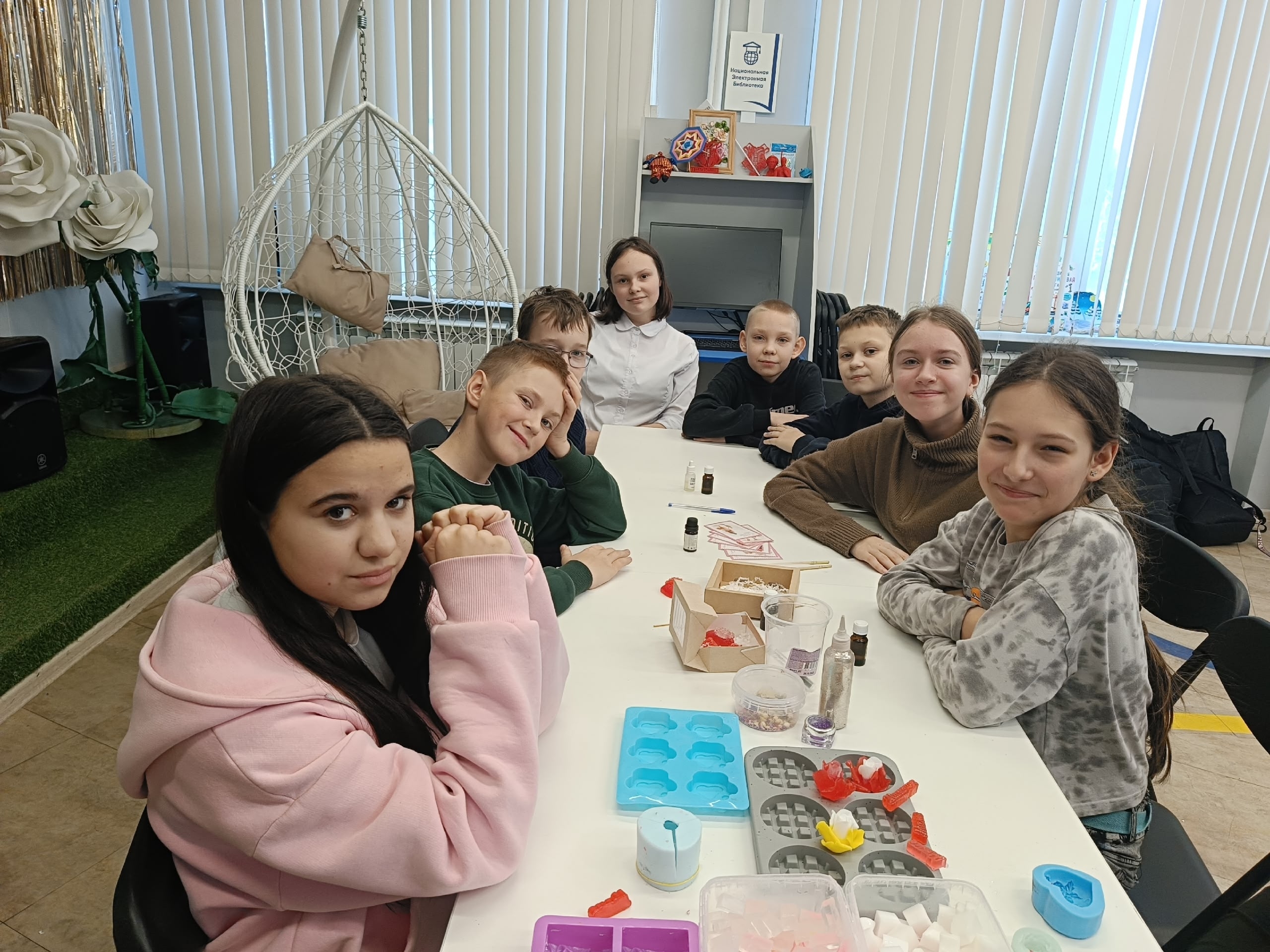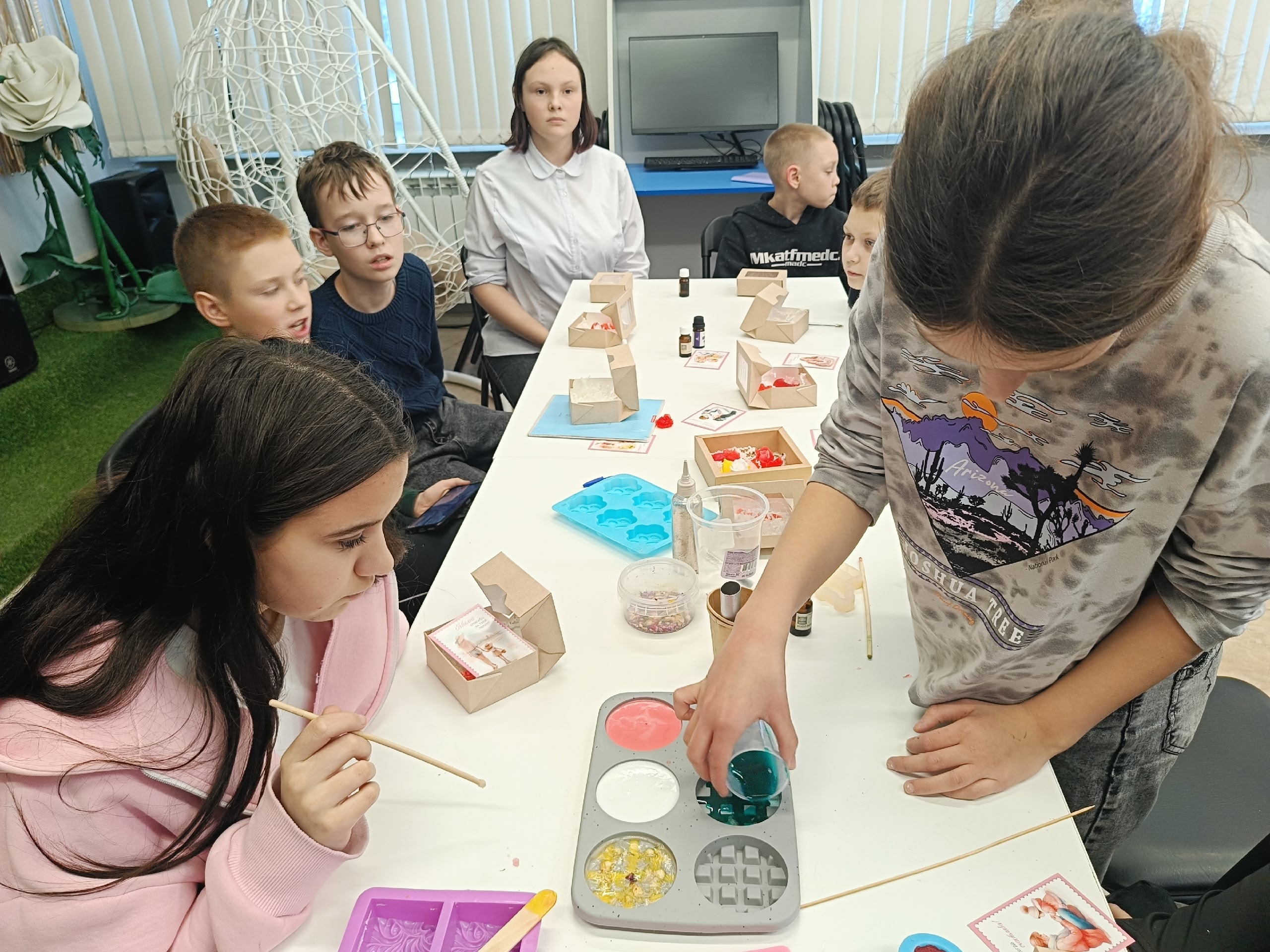 В модельной библиотеки мкр. Каргополь-2 состоялись творческие мастер‑классы «Подарок маме» — участники освоили изготовление набора мыла из готовой мыльной основы для учащиеся начальной школы и 6‑го классов МБУК СШ 2 ОШ 4.