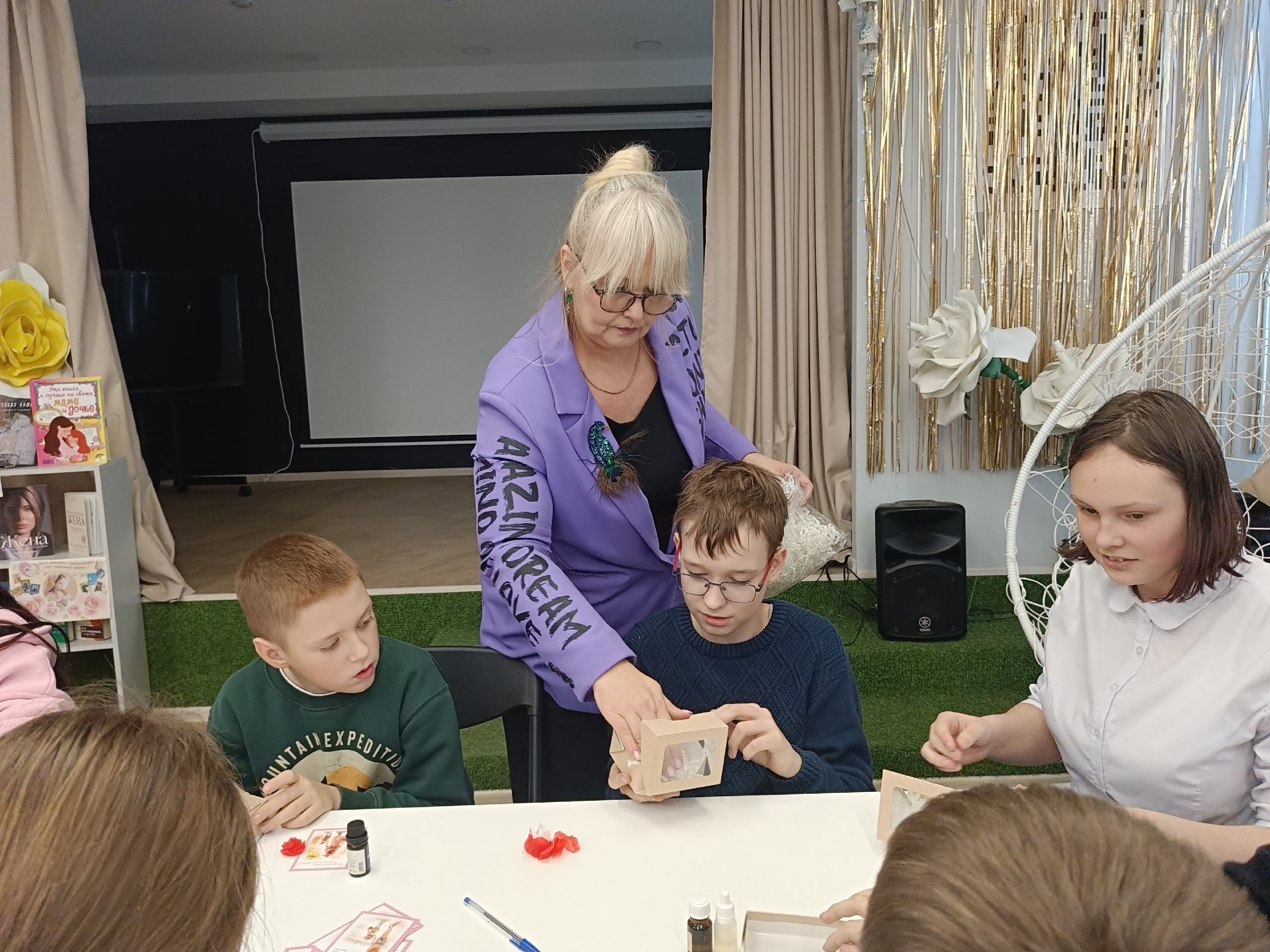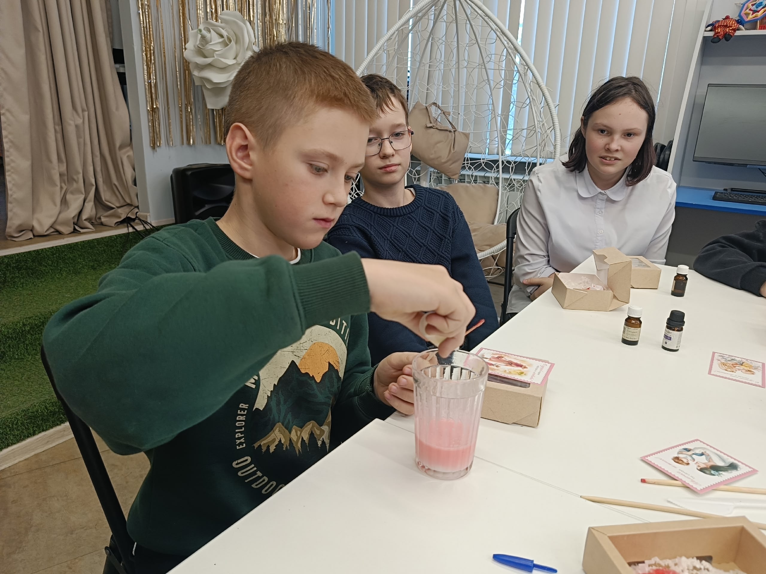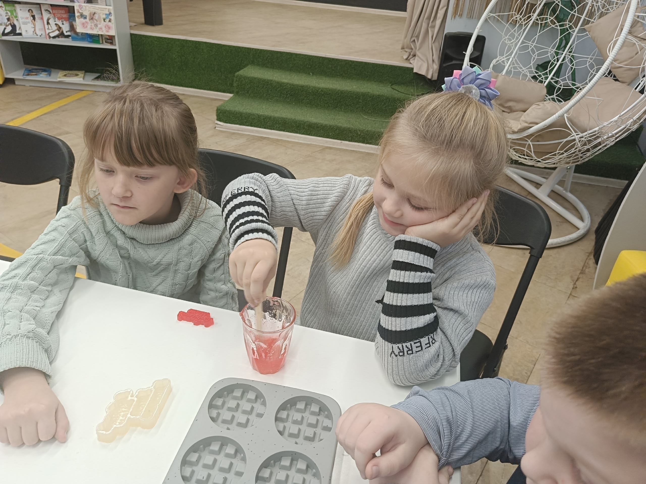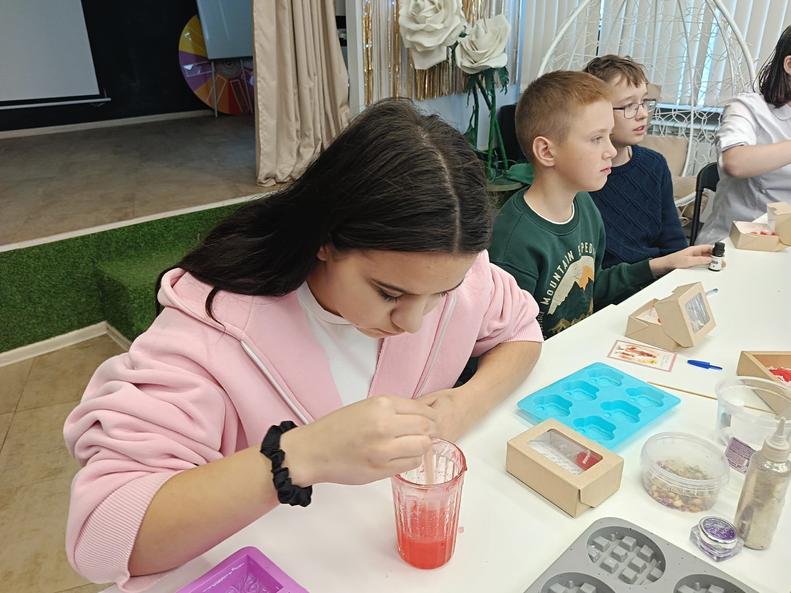 Мастер‑класс был посвящён созданию handmade‑подарка для мам. Ребята научились работать с готовой мыльной основой, осваивая простые, но увлекательные техники мыловарения.