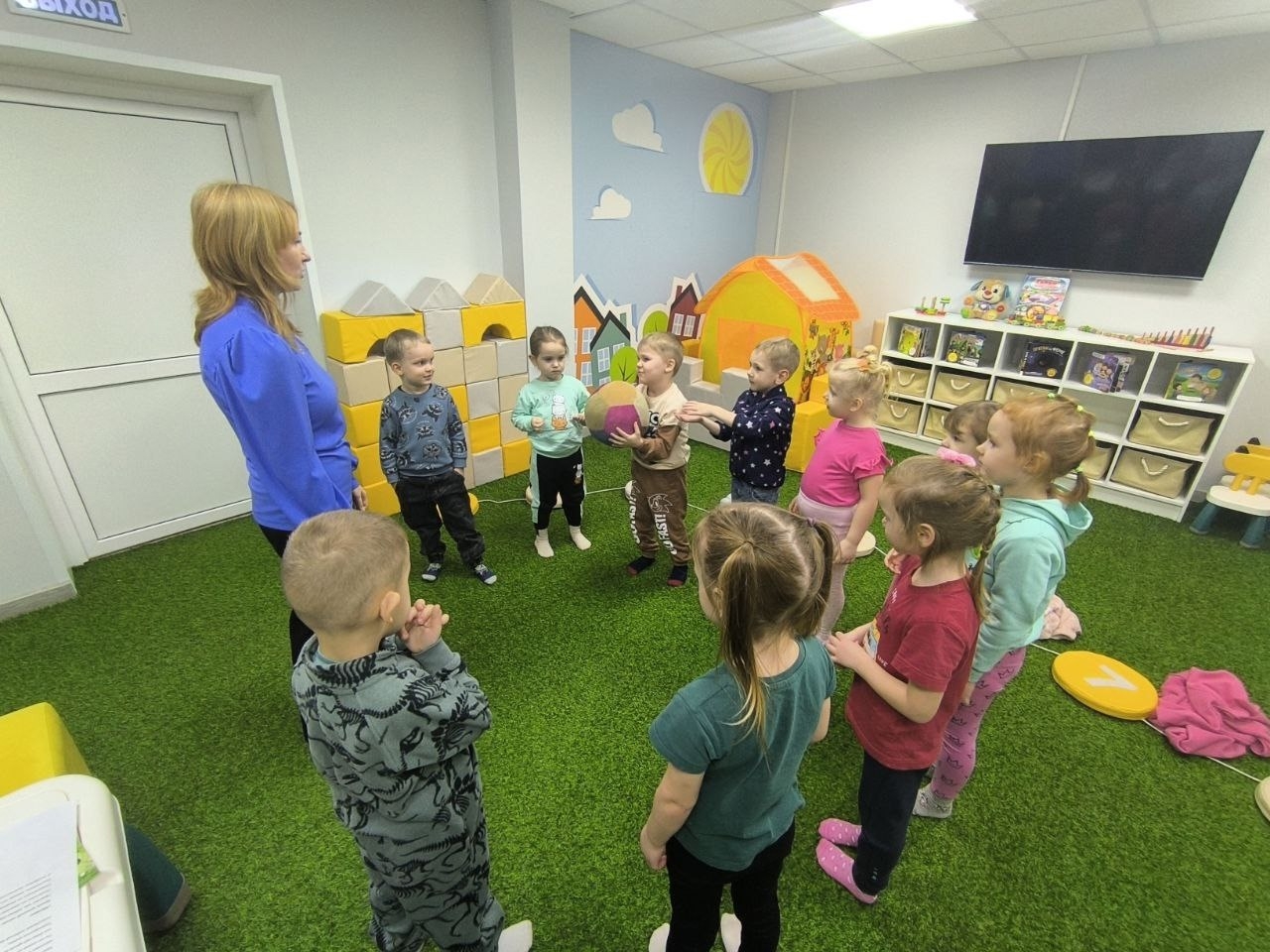 - Устроили веселую разминку с мячом.